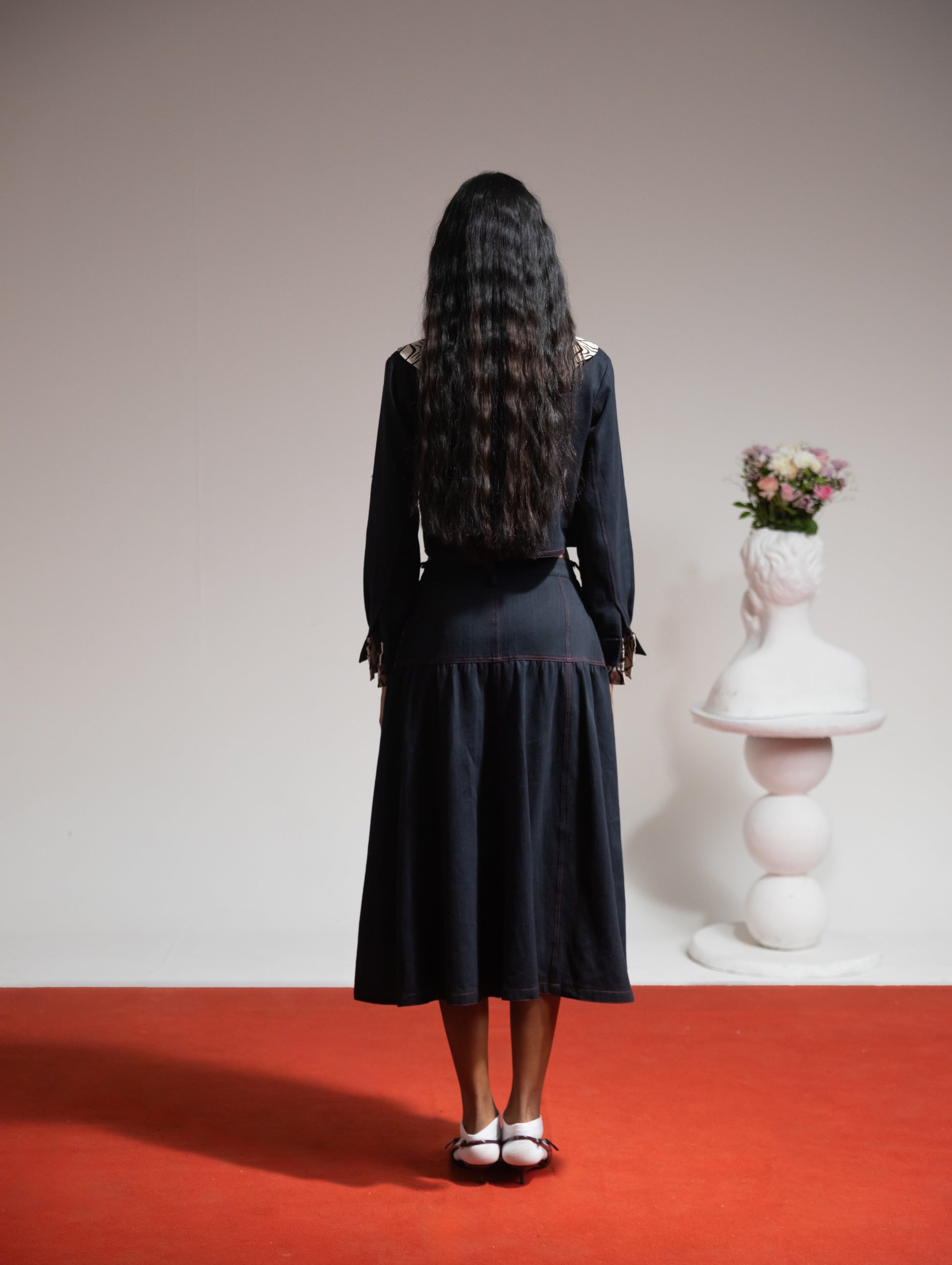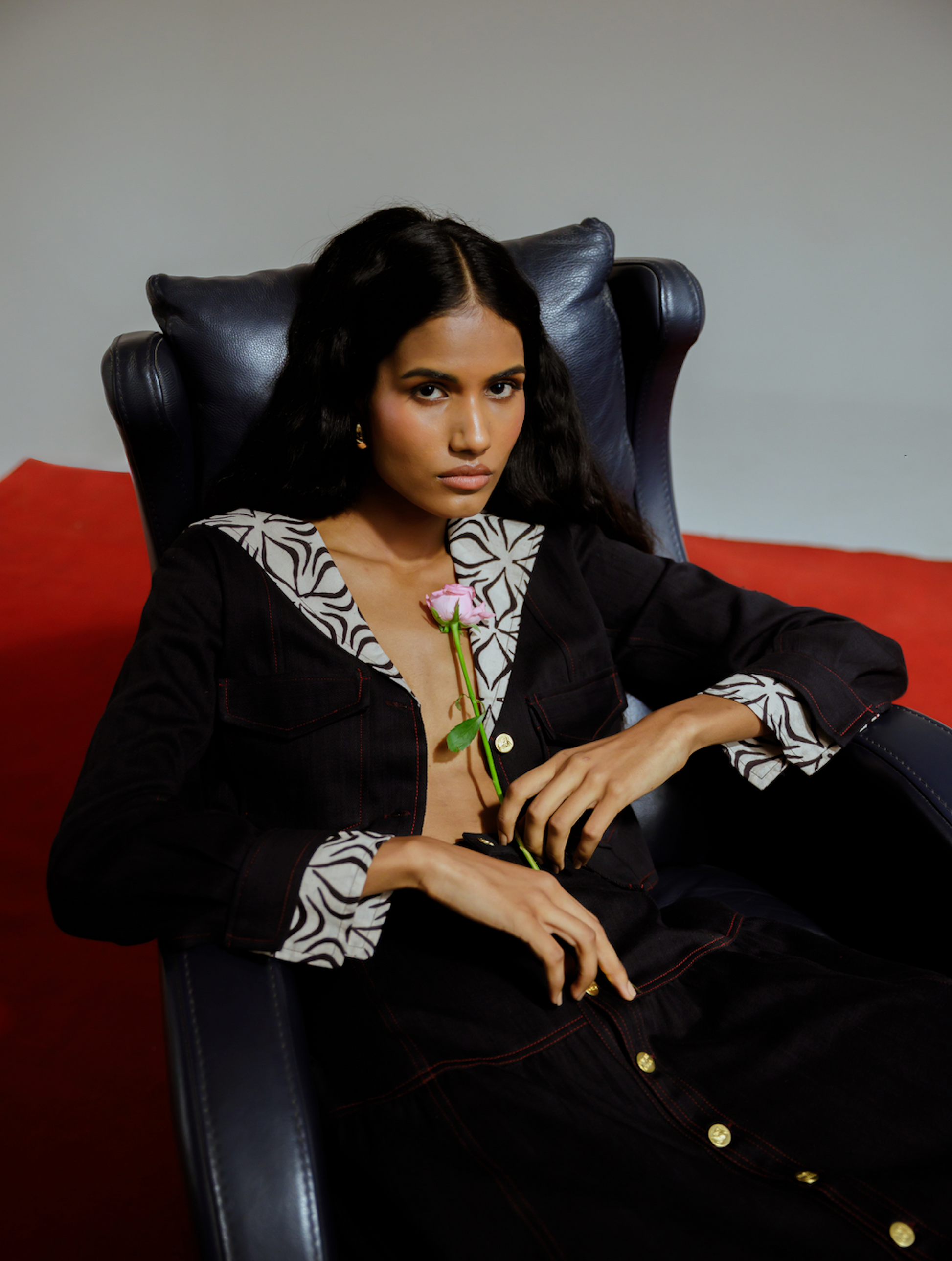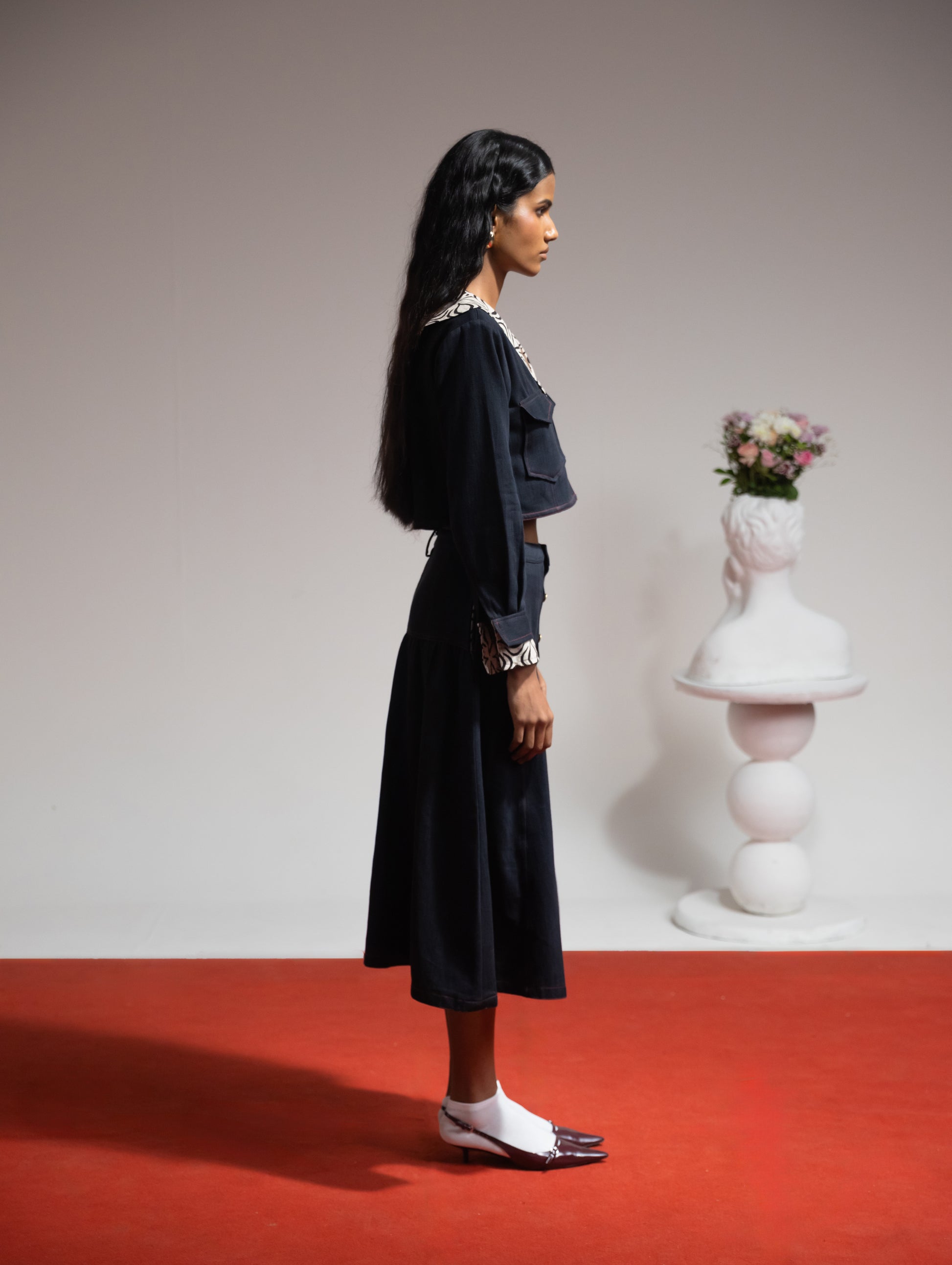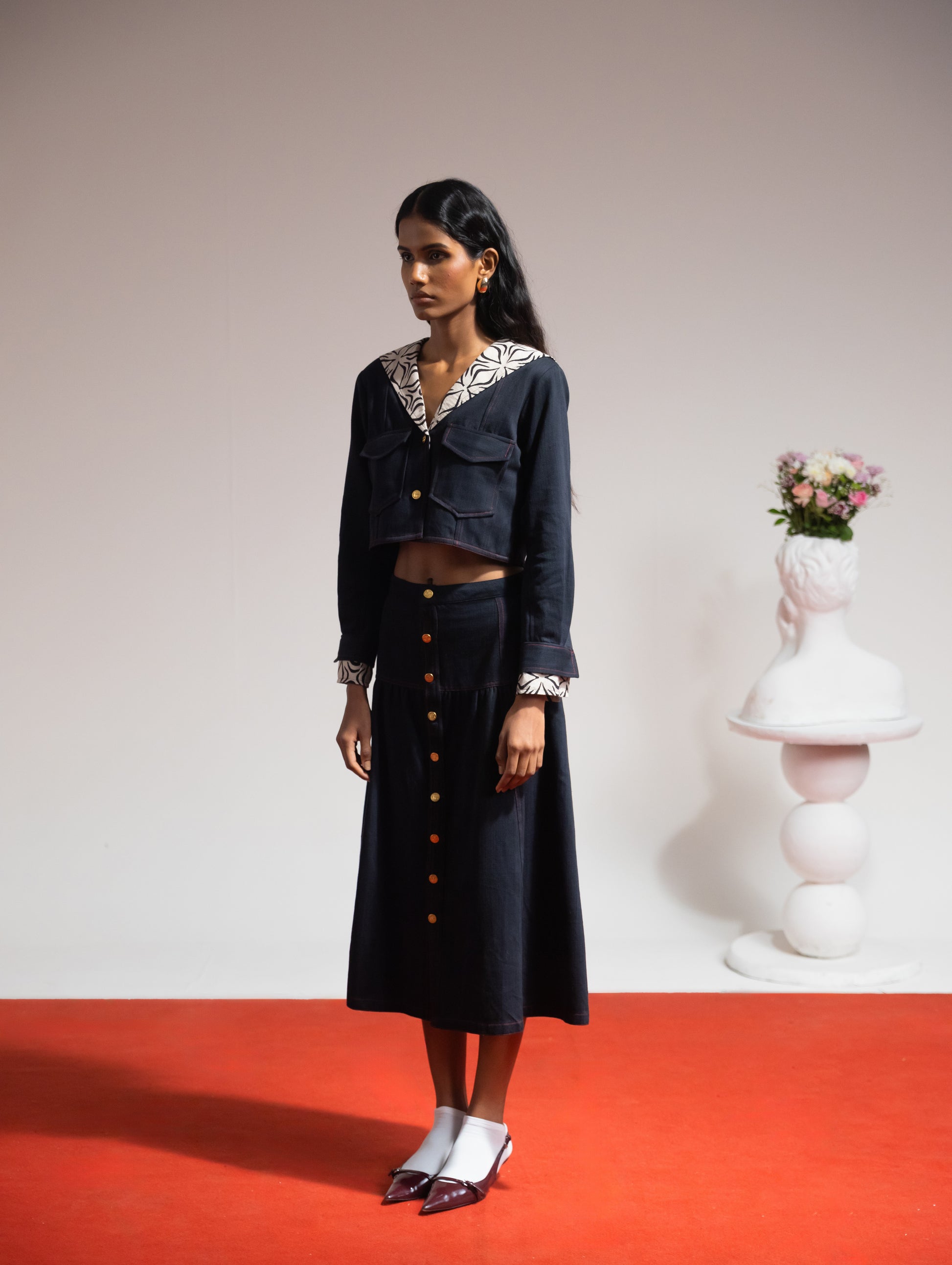 Crafted in handwoven denim, this structured cropped jacket redefines modern utility with artisanal elegance. The collar, cuffs, and lining are highlighted with heritage Ajrakh prints, lending a refined touch of tradition. Finished with signature Nishkalā embossed gold buttons, it embodies understated luxury balancing strength, craft, and contemporary sophistication.