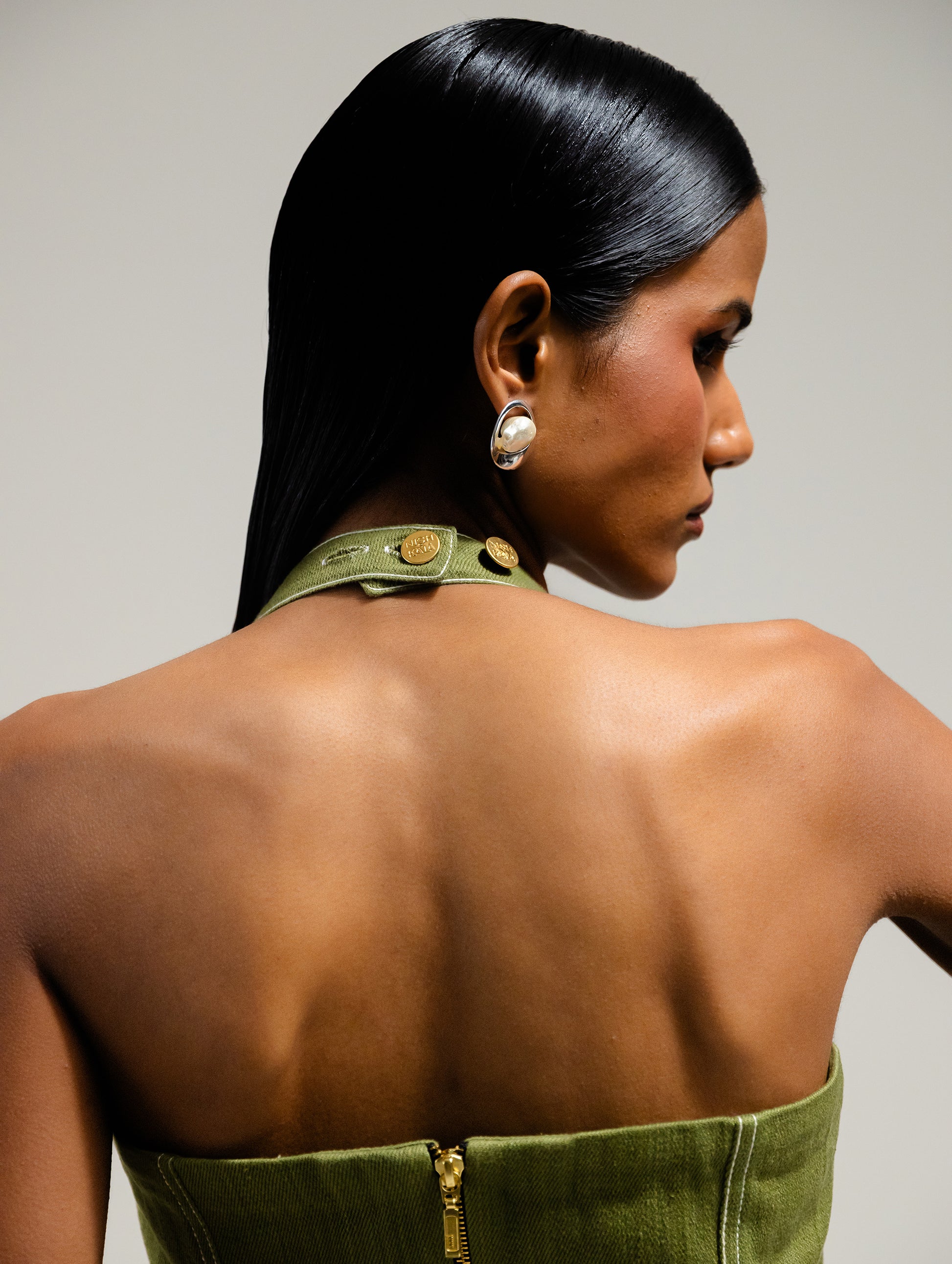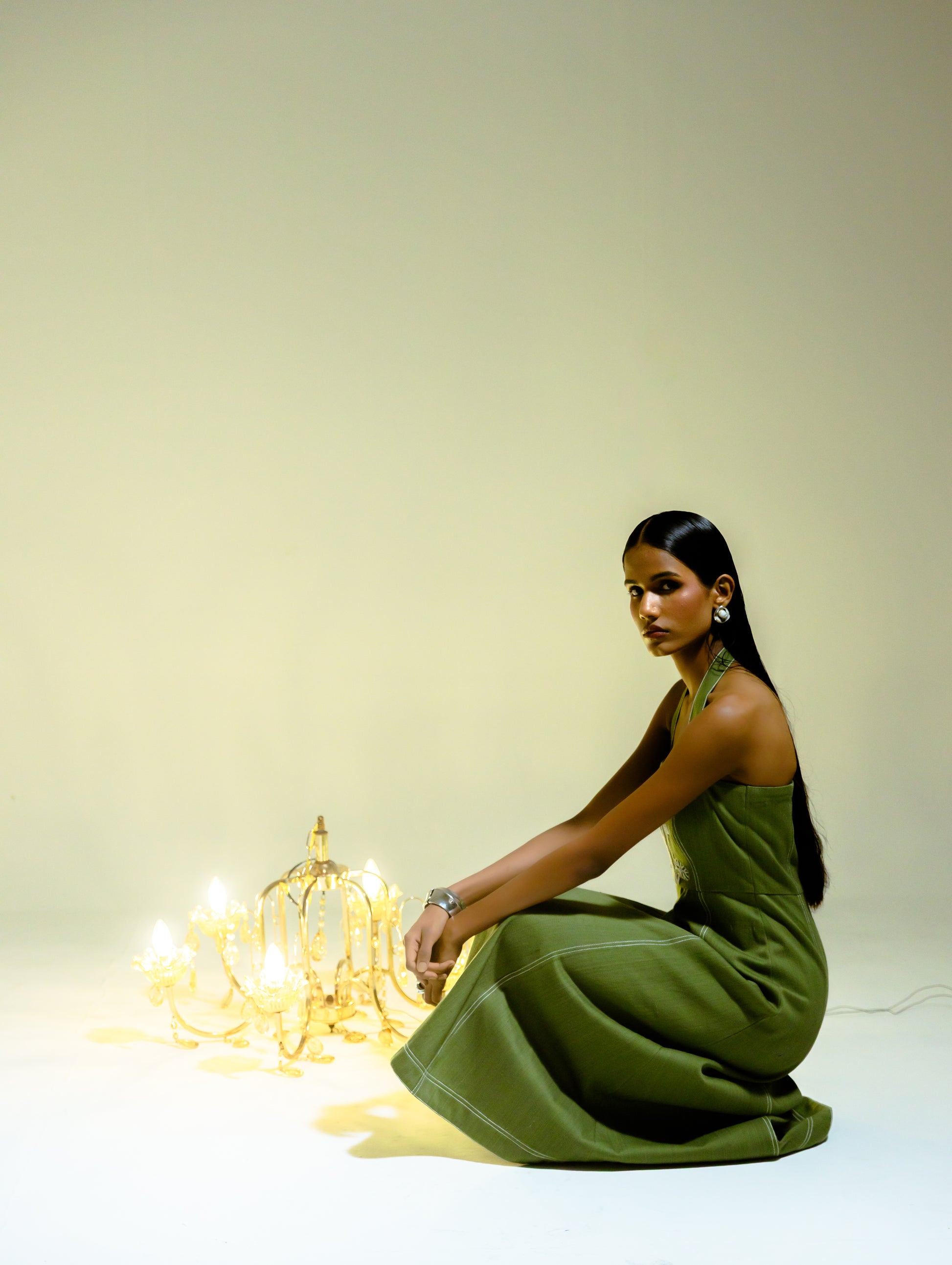 Crafted from handwoven denim in an earthy olive hue, this halter-neck top is elevated with delicate hand embroidery on the yoke. Lotus motifs with trailing stems bring a poetic touch, blending artisanal craft with contemporary design. A piece that embodies quiet strength and refined detail.