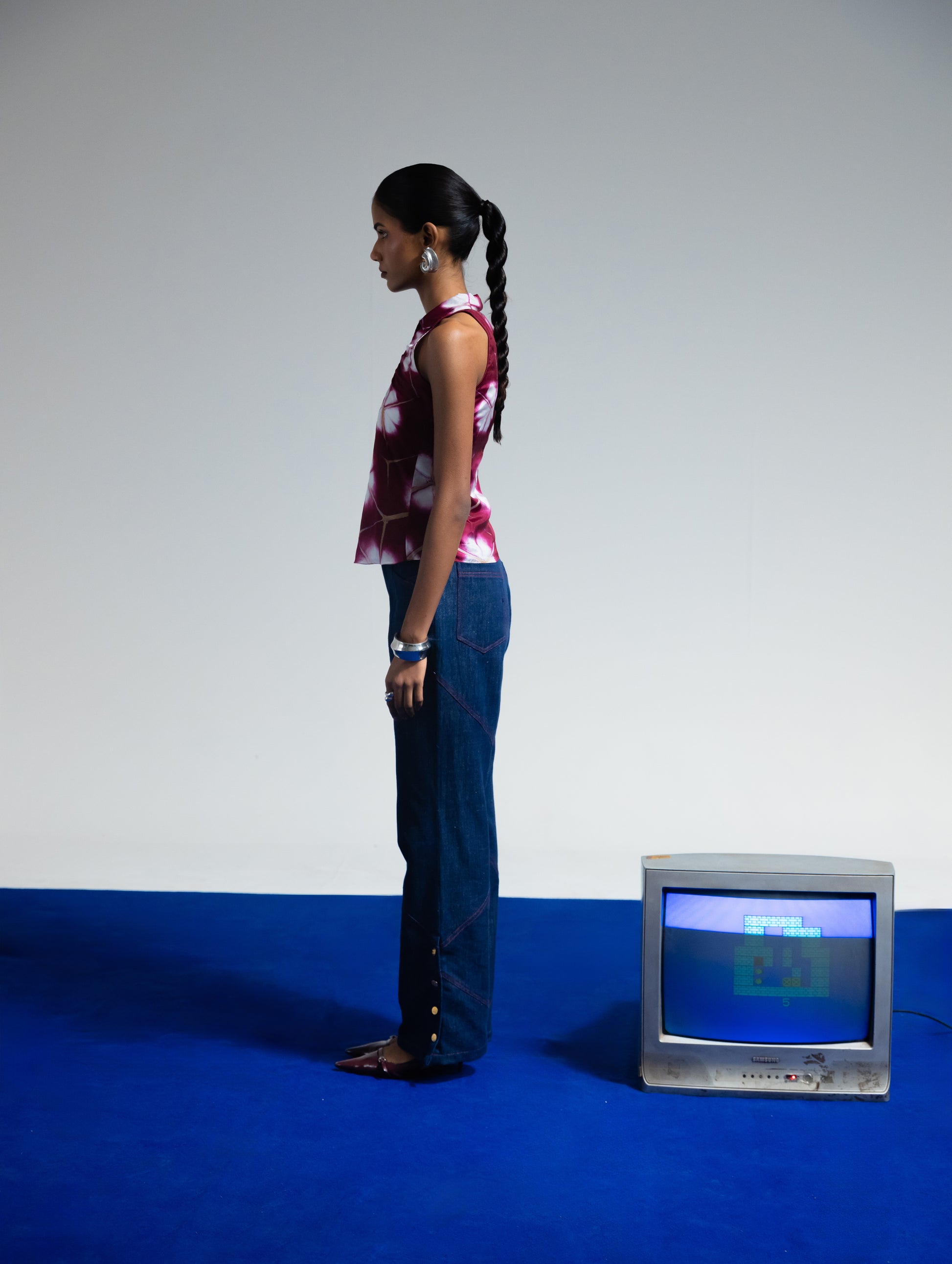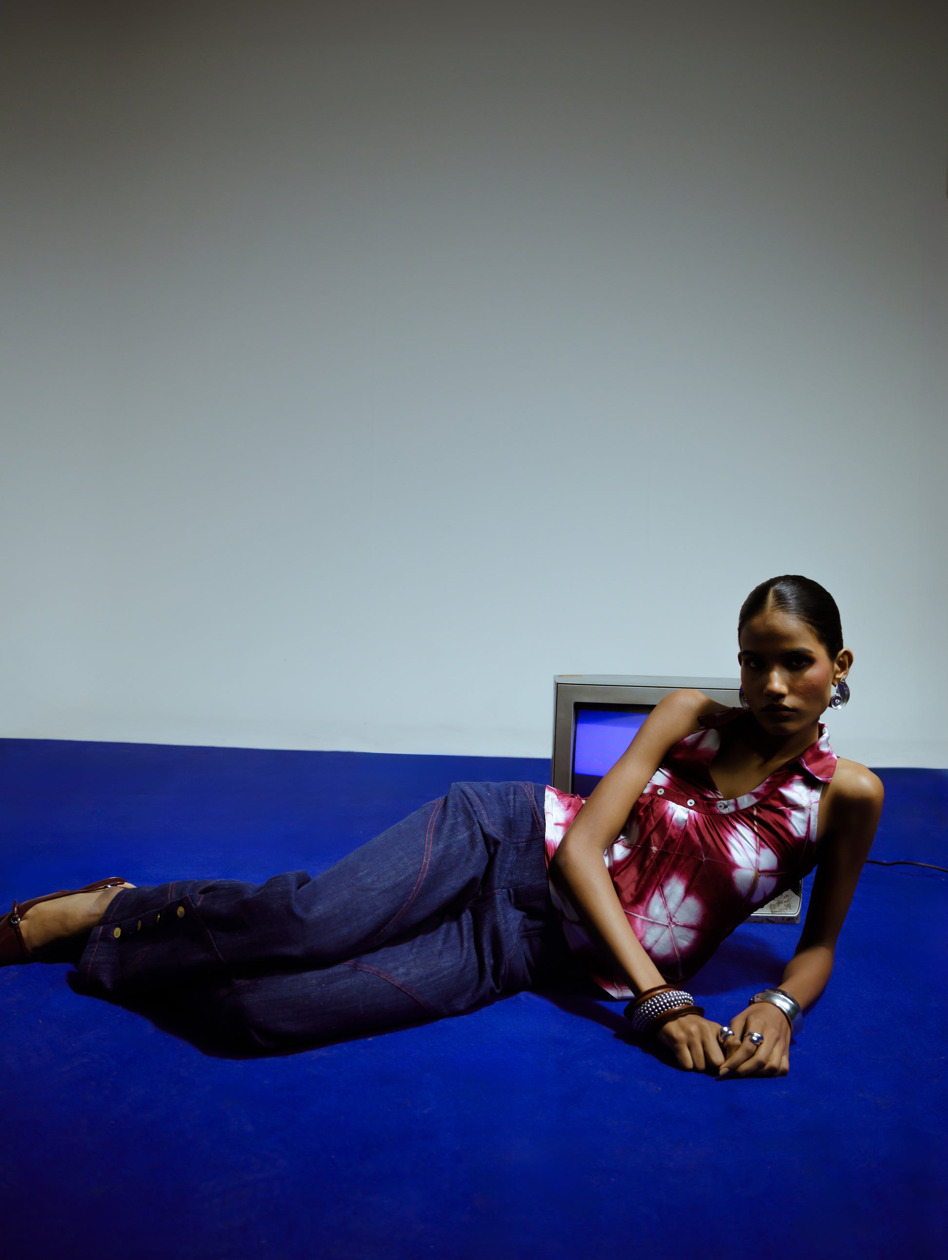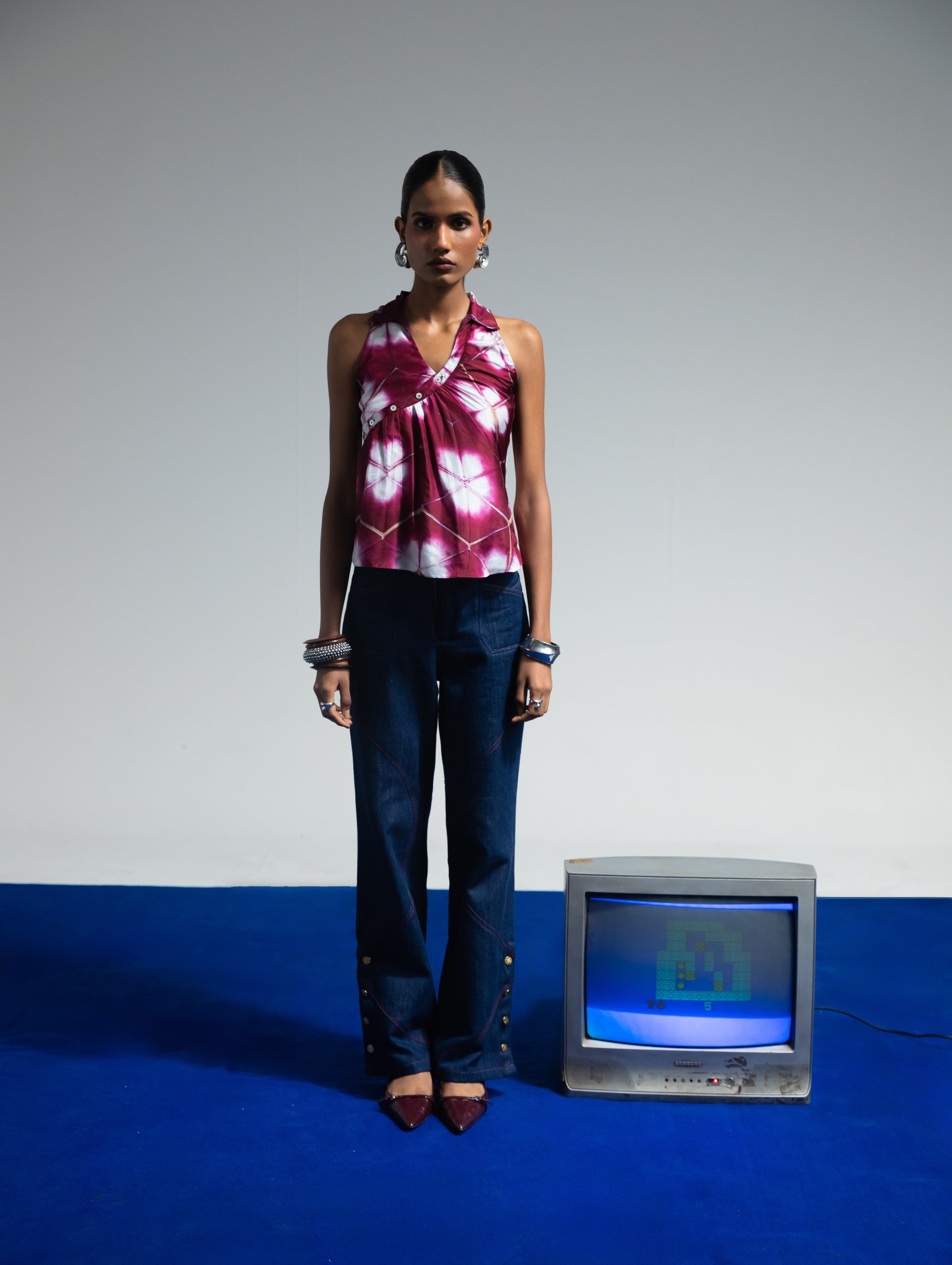 A sleeveless collared top crafted from luxurious habotai silk, featuring a fluid drape and lightweight feel. The piece is meticulously clamp-dyed using the shibori technique, creating striking geometric patterns in rich burgundy and white tones. Each garment is handmade, making every design one of a kind with its own unique artistry.