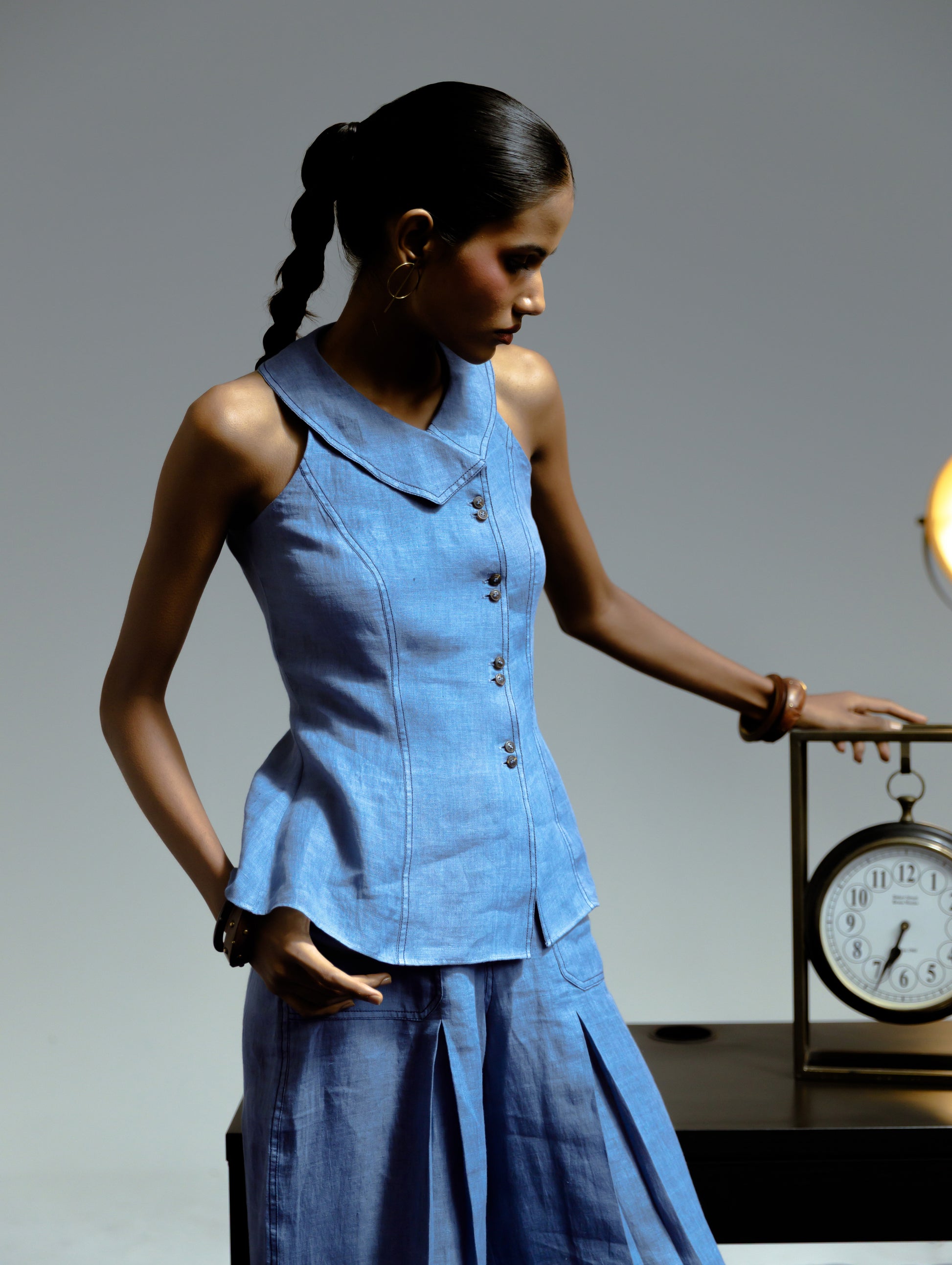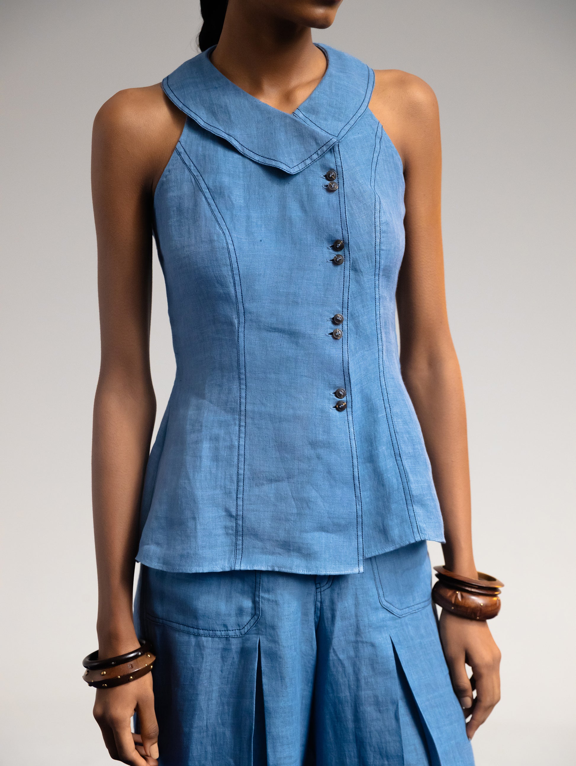 A sleeveless top cut in handwoven linen, designed with sculpted panel lines for a contoured fit. Features a cravat-inspired collar, a gently flared hem, and a concealed placket finished with horn buttons. A structured yet fluid piece that completes the Niṣhkalā linen set.