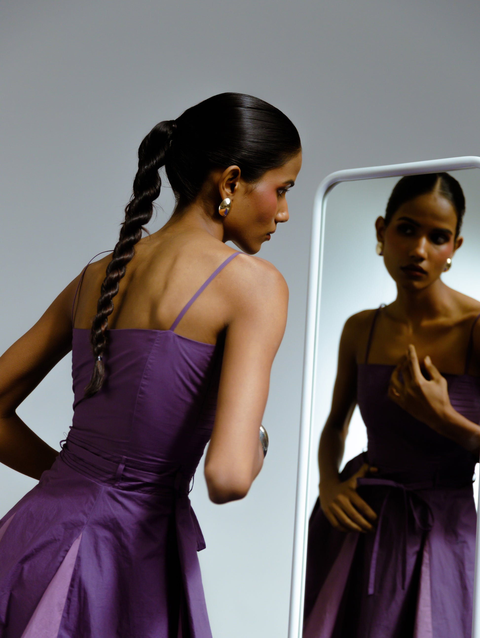 Crafted from organic cotton poplin, this violet mini dress pairs a clean square neckline with delicate straps and a tie-waist detail. Subtle godet inserts in a lilac add movement and dimension to the flared skirt, balancing structure with playfulness. A modern piece that brings effortless elegance in every shade.